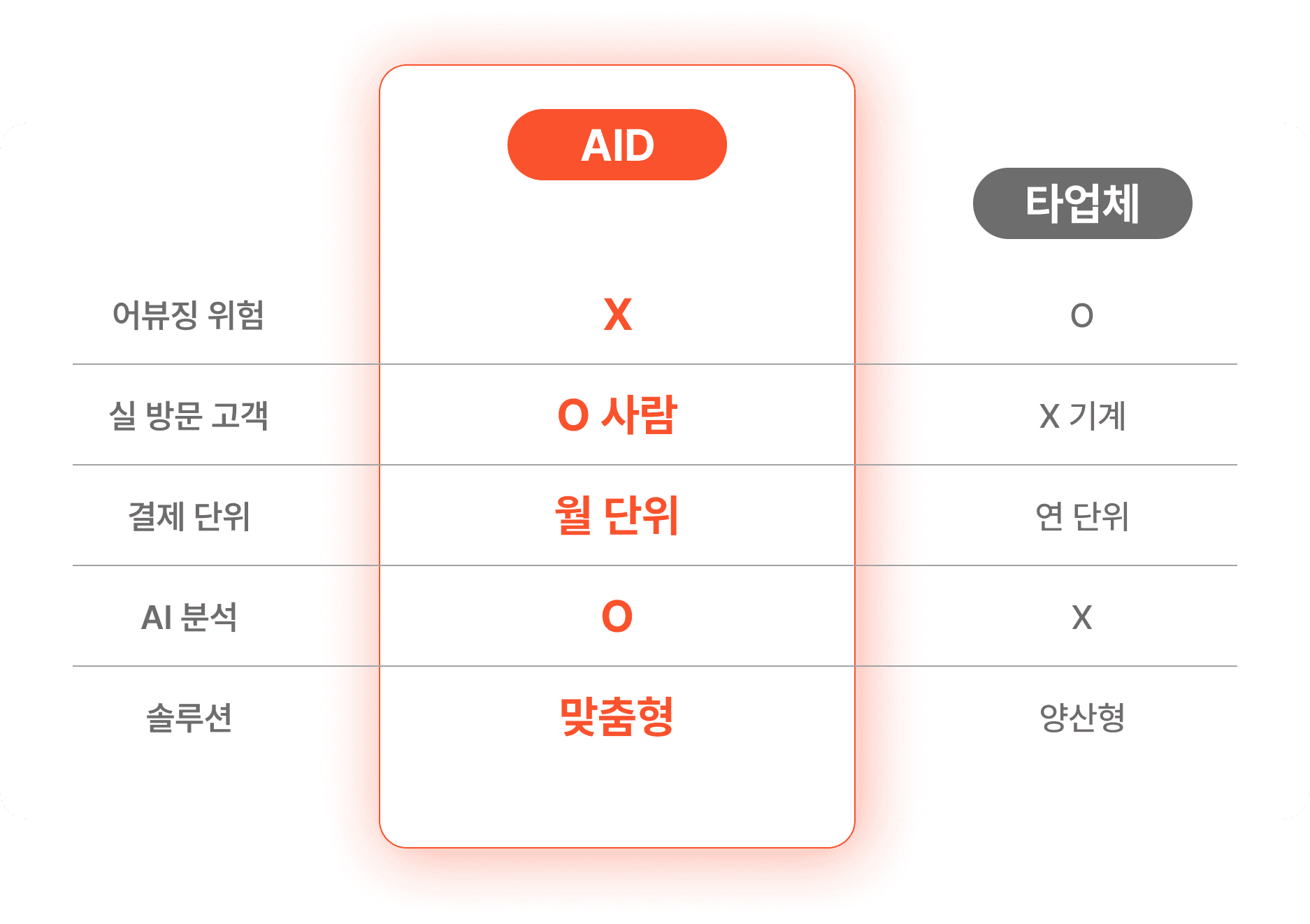 AID는 온라인 셀러의 상품을 네이버 스마트스토어 및 쿠팡 등 주요 커머스 플랫폼에서 상위 노출시키는 데 특화된 마케팅 서비스입니다. 광고에 의존하지 않고 실제 소비자의 검색 유입과 클릭을 기반으로, 상품의 순위를 끌어올리는 정상적인 유입 중심의 노출 최적화를 제공합니다.